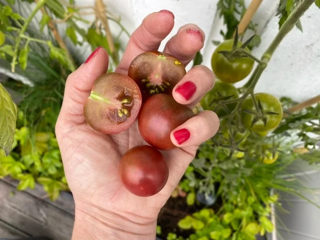 • Smak/bruk: Mørk og aromatisk dråpeformet tomat med lilla-grønt kjøtt. Litt tykt skall, men utrolig søt! Fin til skiver og salat.